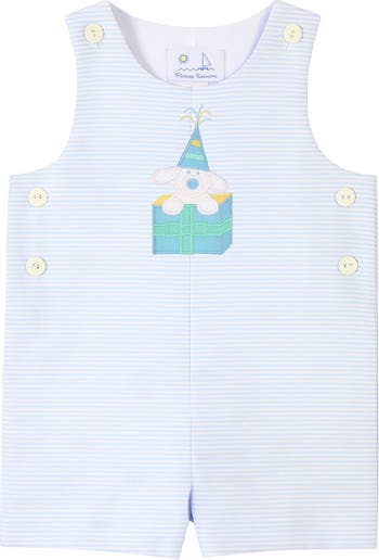 Sweet and playful for sunny spring birthdays, this shortall is crafted from light blue and white stripe seersucker in soft, breathable 100% cotton. A charming appliqué puppy popping out of a present adds a whimsical touch little ones will love. Designed with a sleeveless silhouette and round neckline, it features button shoulders and side buttons for easy dressing, along with a snap inseam for quick changes. Lightweight and comfortable, it‚Äôs perfect for spring outings, special occasions, and picture-perfect moments.