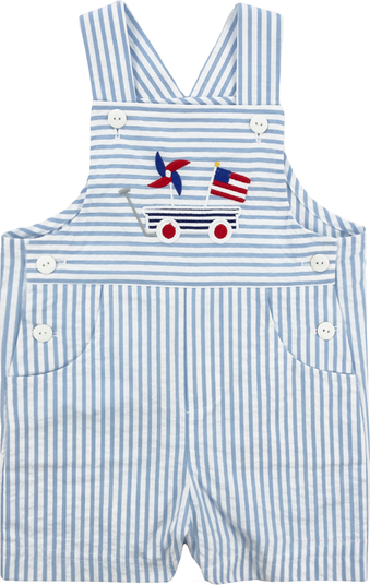 Perfect for patriotic celebrations and sunny adventures, this charming shortall showcases a classic blue-and-white stripe seersucker fabric. Detailed with a whimsical wagon and flag appliqué, adjustable shoulder straps, and functional inseam snaps.