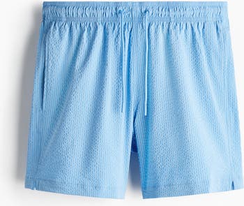 Mid-length swim shorts in seersucker with covered elastication and a drawstring at the waist. Side pockets, a welt back pocket and a small slit at the side of the hems. Mesh inner shorts.
