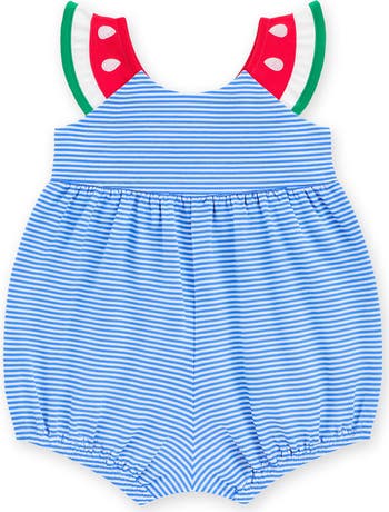 Soft seersucker stripes give this swimsuit a fresh, playful look, accented with charming watermelon seed detailing. Delicate back ties add a sweet finishing touch. Designed with snaps for easy changes and softly shirred legs to stay comfortably in place, this suit balances practicality with classic style. A perfect look for pool days, sunny outings, and warm-weather play.