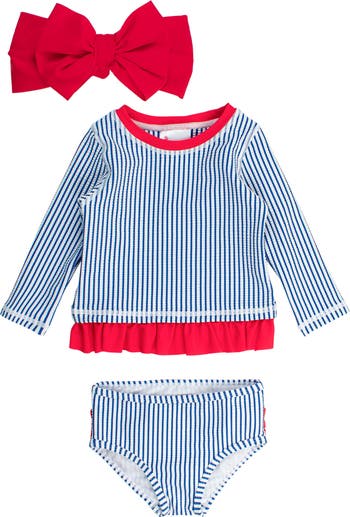 Get baby ready for a day of splishing and splashing with this ruffle-trimmed two-piece swimsuit, which helps protect delicate skin from harmful UV rays with long sleeves and built-in sun protection. A matching bow-topped headband completes the beach-day look.