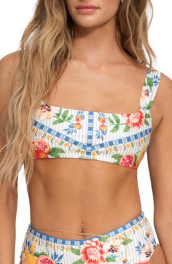Bring vacay-ready vibes to your next pool day in this bikini top fashioned with a perfectly placed print and flirty back ties.