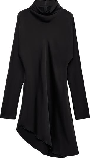 Long sleeves and a turtleneck add polish to the look of this satin frock sewn to be elegantly asymmetric for always eye-catching entrances.