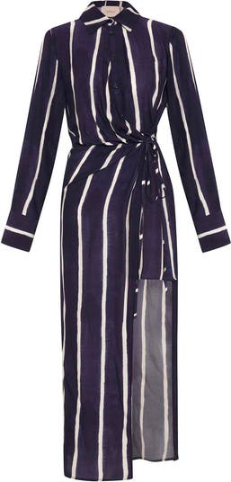 This silky striped shirtdress features a painterly finish, artful waist knot, and asymmetric front slit. A romantic yet modern look designed to move with ease from day to evening.