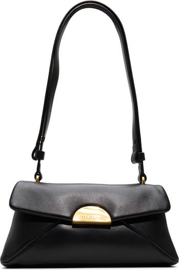 Geometric logo hardware accents the flap of a rich leather bag featuring a divided interior and suspended from a versatile strap that converts for shoulder or crossbody wear.