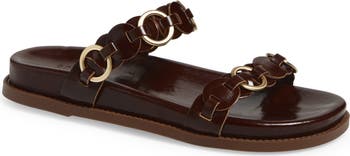 Gleaming rings weave between the leather top straps of this sport-inspired sandal set on a contoured footbed.