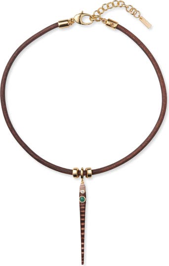 Hook bigger compliments with this corded-leather necklace dangling a sea urchin spine pendant featuring bezel-set cubic zirconia and jade cabochons.