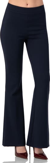 Love these slacks. So comfortable, nice flattering flare. Run slightly large. I am 5'5", waer 2 1/2 inch heal. Perfect 👌