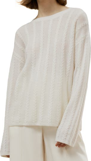 A lightweight semi-sheer crew neck pullover that makes it an easy and versatile piece for all seasons. This classic sweater with twisted cable rib is given an update with 100% cashmere that's softer and warmer. The trendy drop shoulder and relaxed fit make it an ideal piece for most.
