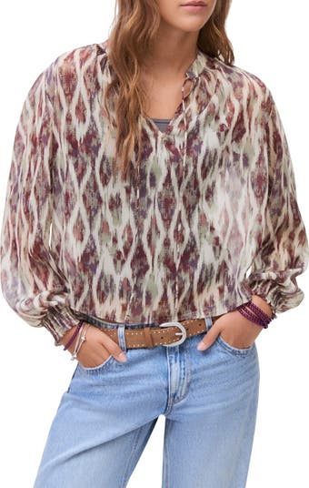 Gently billowed sleeves and a split neckline frame this semi-sheer blouse patterned with an abstract motif.