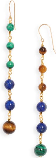 Make a statement with these dramatic drop earrings showcasing brightly hued semiprecious stones that graduate in size.
