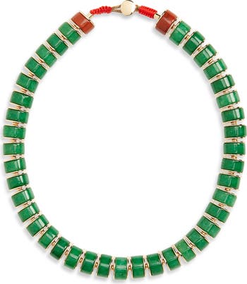 Semiprecious jade and carnelian beads mingle with goldtone spacers on this vibrant beaded necklace designed to deliver bold color and elegant polish.