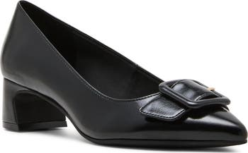A walkable heel gives you a boost in this pointy-toe pump topped with oversized buckle detailing.