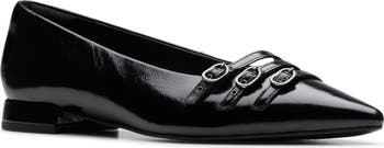 Three slim buckle straps bring refined polish to this chic pointy-toe flat made from glossy leather.