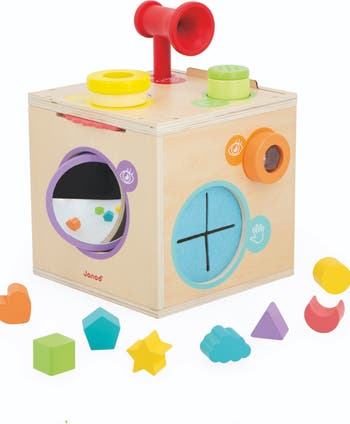 Little ones can work on discovering and developing their smell, hearing, touch and sight with this colorful sensory box that features fun activities adults can do with their child. Aromatic herbs help develop a sense of smell, while a megaphone brings awareness to little voices. Different shapes and texture help develop a sense of touch, while a colorful kaleidoscope allows children to look at objects and surroundings through different filters.