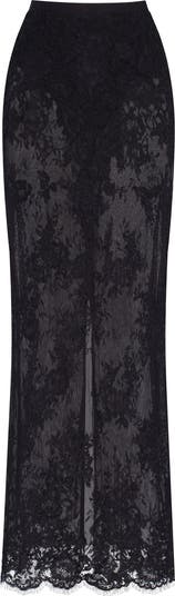 Alluring lace maxi skirt with high waist, back slit, and mini lining for coverage. Floral appliques add depth; perfect with a corset for evening allure
