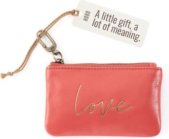 A sweet message and compact silhouette define a zip-around leather pouch that affixes to your bag and keeps change or other small items close at hand.