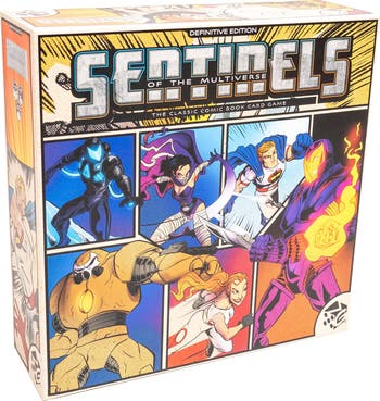 A mad scientist hold the world hostage with is terrifying inventions. An alien warlord from a far away galaxy brings his army of bizarre minions to conquer the planet. A giant rampaging robot cuts a swath of destruction across the coastline. Who can possibly stop these villains? A team of powerful heroes stands between the world and the forces of evil. Take your place as a hero and answer the call to protect the Multiverse! Sentinels of the Multiverse: Definitive Edition is the award-winning cooperative comic-book card game in which you and your friends team up as mighty heroes to thwart the nefarious plans of the villains who threaten the entire Multiverse! Now bigger and better than ever! First introduced in 2011, Sentinels of the Multiverse quickly became a fan-favorite comic book card game, and now is rereleased in this Definitive Edition! With more powerful heroes, fearsome villains, and dynamic environments than ever before, and introducing all new content, including "first appearance" hero character card variants and playable events from the history of Sentinel Comics!