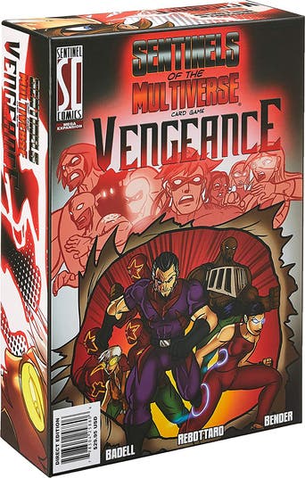 Sentinels of The Multiverse: Vengeance - Vengeance is a mega expansion, which comes with a complete team of 5 heroes. It also features two very exciting environments. But the truly exciting part of Vengeance is the villain team: The Vengeful Five! Baron Blade has collected an impressive array of villains to take down the Freedom Five, but the primary 5 are Baron Blade himself and four other figures, who may be familiar to Sentinels fans. In Vengeance, you will play a team of heroes fighting a team of villains, each with their own abilities and synergies! The effective fighting style of the heroes of the multiverse will be seen in a villain team now! With team boosting effects, supporting actions, and coordinated attacks, the Vengeful Five will take on the hero teams! And, if Baron Blade has his way, the heroes will be defeated at last! Are you ready for Vengeance? Baron Blade is.