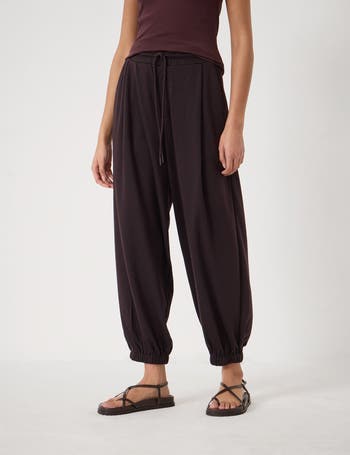 Fluid drape and relaxed silhouette, drawstring waist and cinched ankles create an understated leisure look that moves with you.
