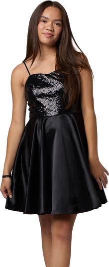 Sparkling satin light up the bodice of this tulle party dress that'll have your kiddo ready to celebrate the good times.