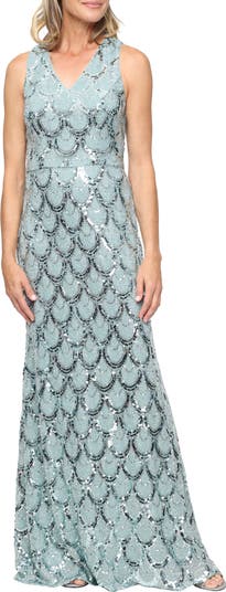 Sequined scallops and sparkling beads shimmer across this sleeveless V-neck gown, creating a luminous, light-catching finish. Designed in a soft A-line silhouette, the gown is washed in a watery shade of blue that enhances the fluid, ethereal feel.