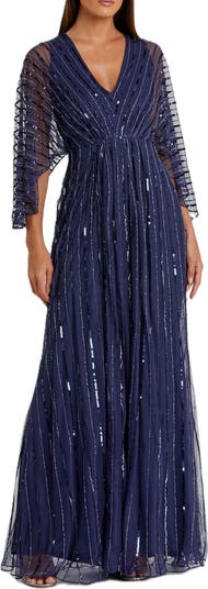 Sequin beaded stripe gown with a flattering V-neckline and sheer cape sleeves for an elegant look. Perfect for weddings, galas, and formal events.