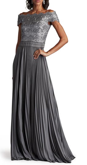 Shimmering sequins give way to swirling pleats in a gorgeous gown designed to get glasses raised.