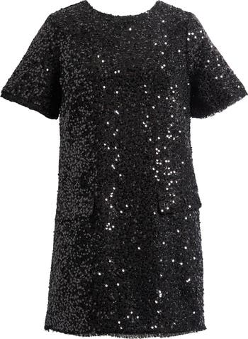 Shimmering sequins dazzle on this chic bouclé shift dress designed in a mini silhouette with roomy front flap pockets.