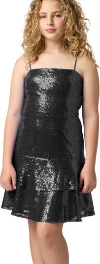 A tiered skirt gives extra movement to this sequin-adorned party dress that'll sparkle with each step they take.