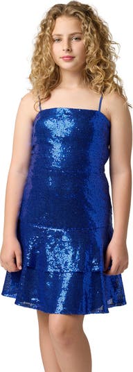 A tiered skirt gives extra movement to this sequin-adorned party dress that'll sparkle with each step they take.