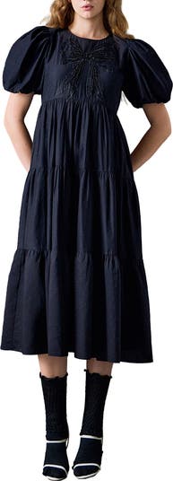 A bejeweled bow brings party potential to a tiered dress fixed with charming puff sleeves and cut from swishy organza.