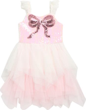 This sleeveless sress made from layers of fluttery tulle sparkles with a sequin bodice detailed with a pretty bow.