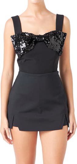 A large sequined bow charms the top of this sleek tank top cut from stretch fabric so you can move from party to party effortlessly.