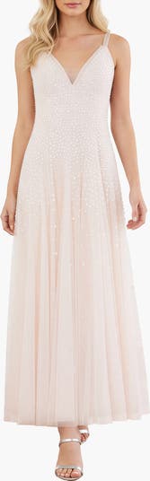 The Sequin Cascade Cami Plunge Gown. This beautiful dress features shimmering embellishment in contrast cream tones. The deep V neckline and layered tulle skirt create a flowing silhouette, while the sequins scatter across the surface for an iridescent effect. A captivating piece for unforgettable looks.