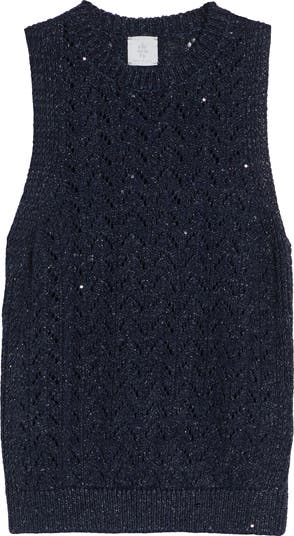Layer with intention with this linen-enriched sweater-vest reworked with airy open stitching and a dusting of sequins that glint in motion.