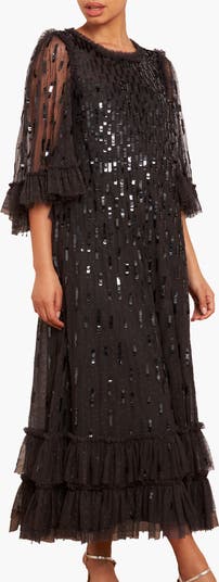The Sequin Dash Ballerina Dress is a ballerina length dress, adorned with statement, square sequins in a staggered linear layout creating a shimmer throughout. Developed with a loose silhouette for an effortless, floaty feel featuring voluminous sleeves for a romantic look. The perfect dress for an upcoming special occasion.
