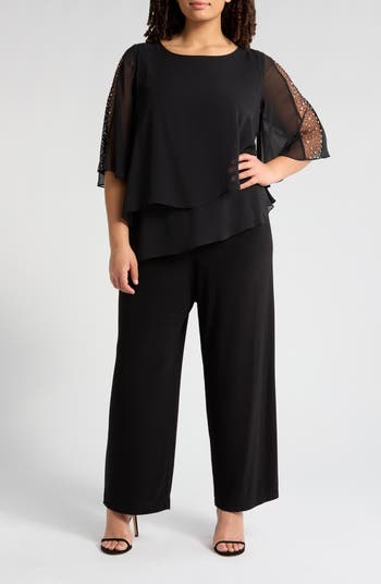 Get to the festivities faster in a one-and-done jumpsuit designed with sequin accents and cascading rows of ruffles at the bodice.