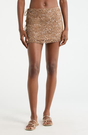 Shimmer from point A to beach in the sequin mesh cover-up miniskirt secured with dual ties at the side slit.