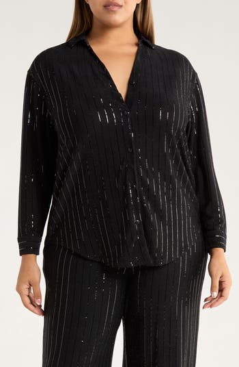 Lines of minuscule sequins on this tunic-length button-up shirt catch the light wherever you go for an effortlessly glamorous look.