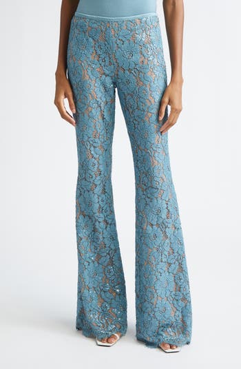 A contrast silk lining plays up the sequin-sparked floral-lace construction of these romantic yet commanding pants that flow into a sleek flare-leg silhouette, with scalloped hems offering a soft finish.