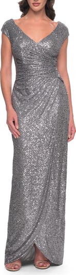 Chic sequin dress with tulip hem and ruching along the waist. V neckline and cap sleeves. Back zipper closure.