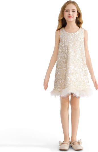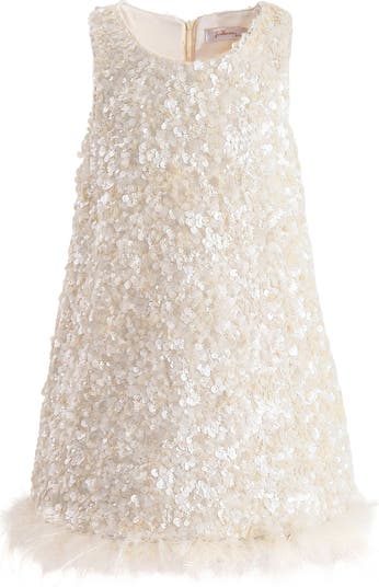 A dazzling silhouette for standout occasions—this sleeveless design sparkles with sequin texture and finishes with a soft feathered hem for a touch of whimsy. Allover white and ivory sequins with round neckline and back zipper. Feather-trimmed hem adds movement and playful elegance
