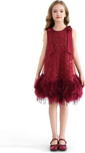 A dazzling choice for festive occasions, this sleeveless dress sparkles with sequins and finishes in a whimsical feathered hem. Satin shoulder ties add a soft, elegant touch to the shimmering silhouette.