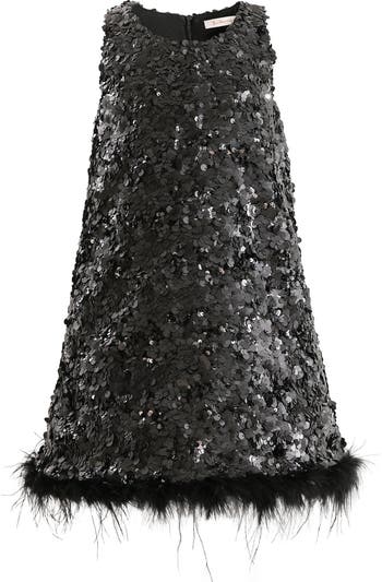 Make a bold entrance in this dazzling dress, designed to shimmer and sway with every step. Its sleeveless A-line silhouette is drenched in glossy sequins and finished with a dramatic feathered hem—perfect for parties, portraits, or any moment that calls for sparkle.