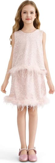- Feather trim accenting waist and hemline