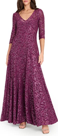 Steal the show in this glamorous gown adorned with lustrous swirling sequins and finished with a flowy dancefloor-ready skirt.