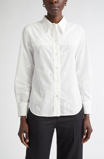 Elevate any ensemble with this refined take on the classic white button-up shirt detailed with a distinctive front yoke and floral embroidery rendered in tonal sequins.