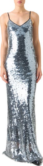 This long sequined gown creates a luminous, fluid effect with translucent, mirror-shine paillettes over black netting in a trailing silhouette. The minimalist slipdress design and graceful drape make it a luxurious statement piece that exudes modern glamour.