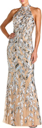Striking and glamorous, this halter gown features allover sequin beading, a sleek column silhouette, and a dramatic low open back for bold evening appeal.